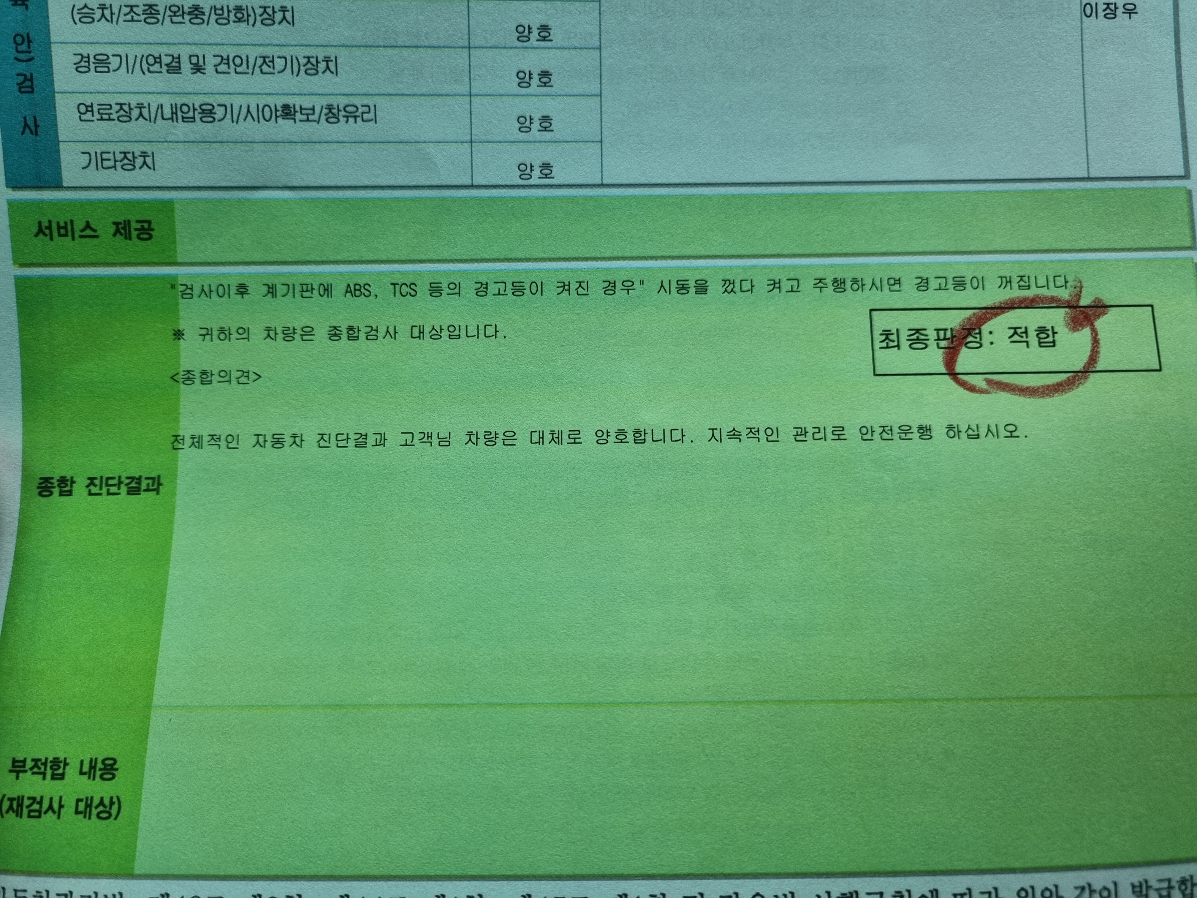 차량번호 확인과 함께 완료된 검사지를 꼼꼼하게 확인시켜 주면서 결과에 대해 다시 한번 말씀해주십니다.