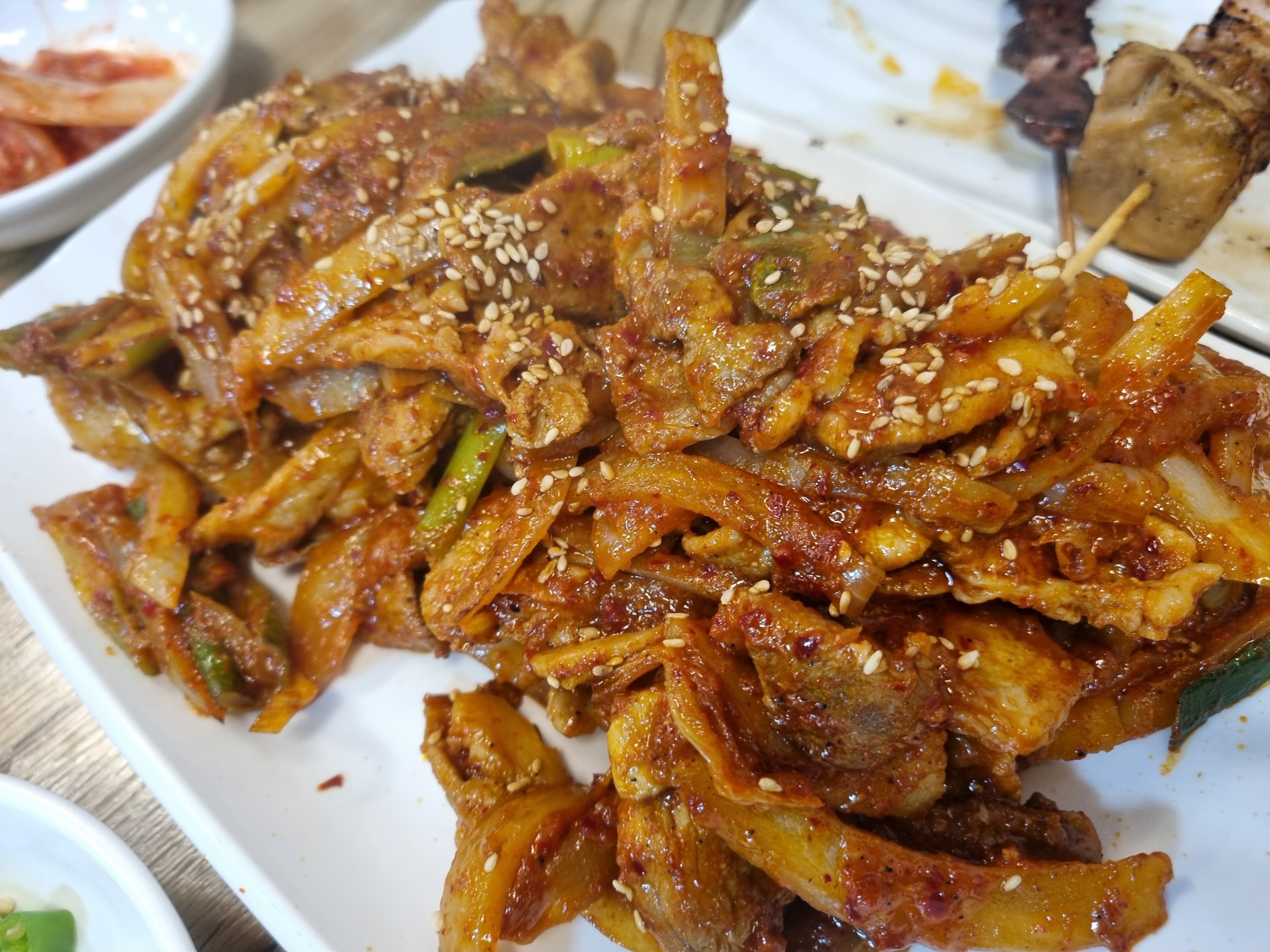 이게 찐이죠. 불맛 가득한 닭꼬치를 매운 소스에 푸욱 담가 입안 가득 넣고 씹으면...