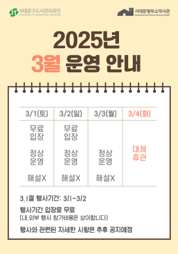 - 서대문형무소역사관 주차장은 협소하므로 대중교통 이용을 추천합니다.